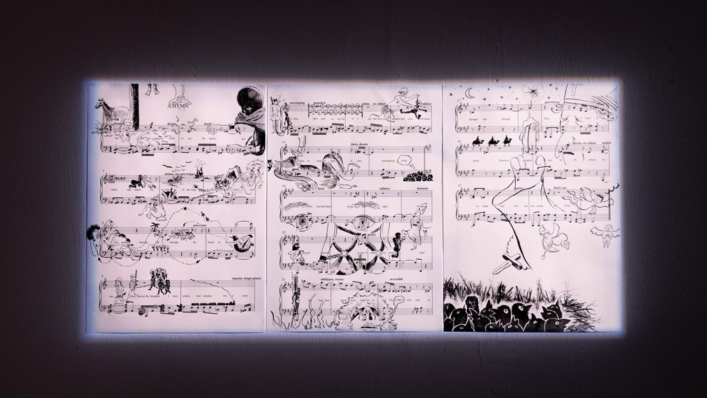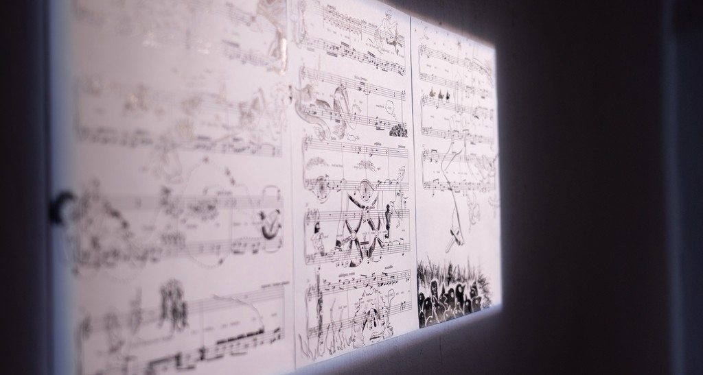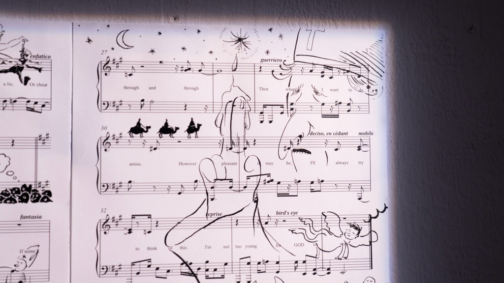 I translate this mechanical training of the tongue, into a melody on sheet music and add illustrations. Through the guitar's slides and stops, the sacred religious warning transforms into an absurd noise.